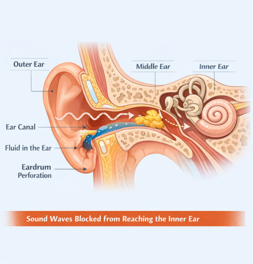 Conductive hearing impairment occurs when there is a problem with the outer or middle ear that interferes with the passing sound to the inner ear.