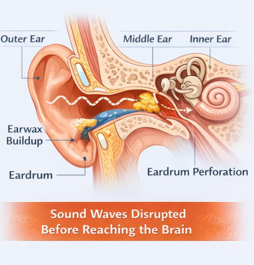 Sound travels through the outer and middle ear to reach the inner ear, where tiny hair cells convert it into nerve signals the brain can interpret. Damage in any part of this system — especially the inner ear — can reduce hearing clarity.